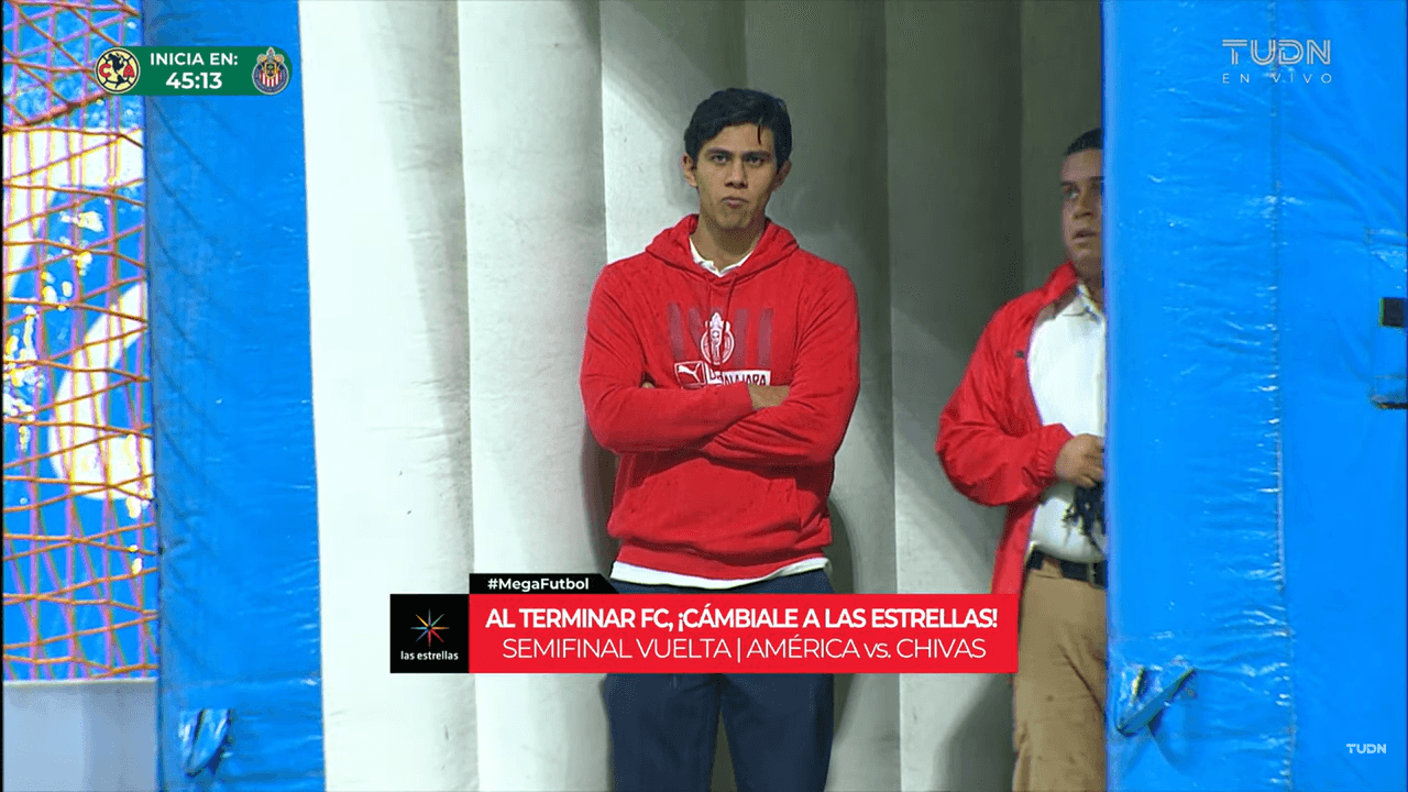El delantero de Guadalajara fue convocado de manera sorpresiva para el América vs. Chivas, sin embargo no aparece ni en la banca del conjunto rojiblanco. Macías fue visto en la cancha mientras algunos de sus compañeros empezaban el calentamiento.