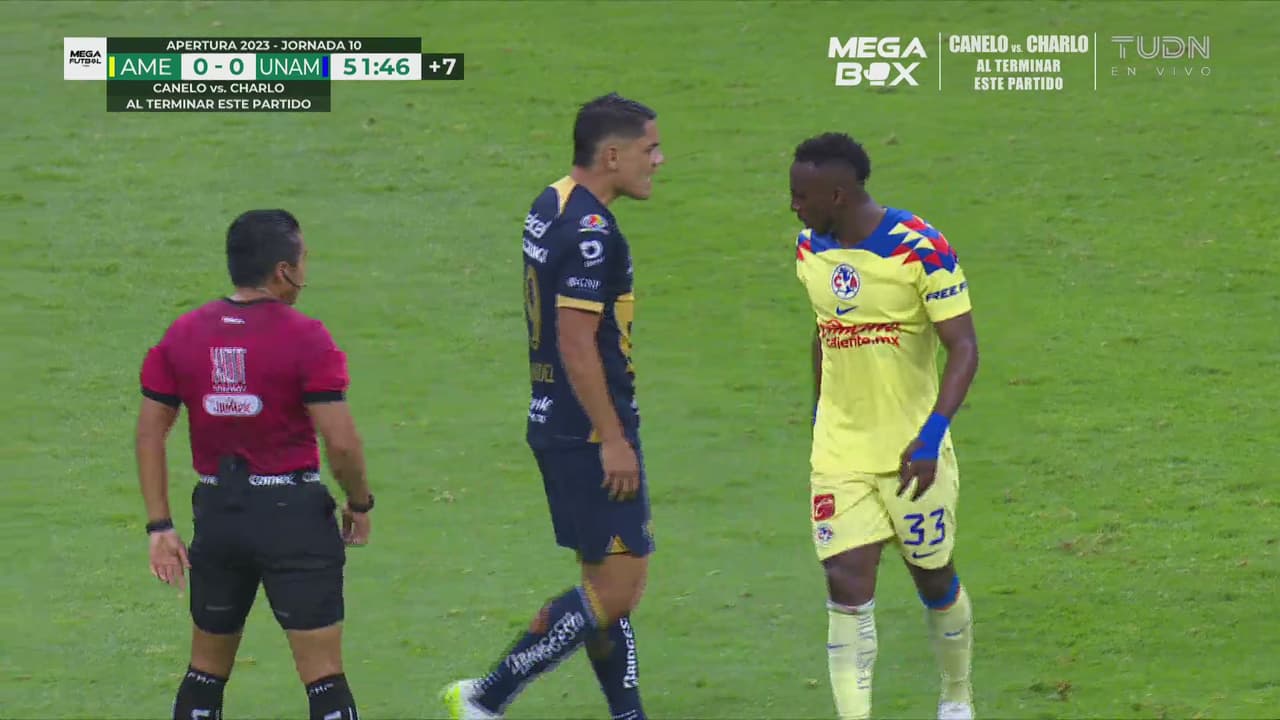 11' El delantero de América reclama y se hace acreedor a una tarjeta de amonestación, primera de este Clásico Capitalino.