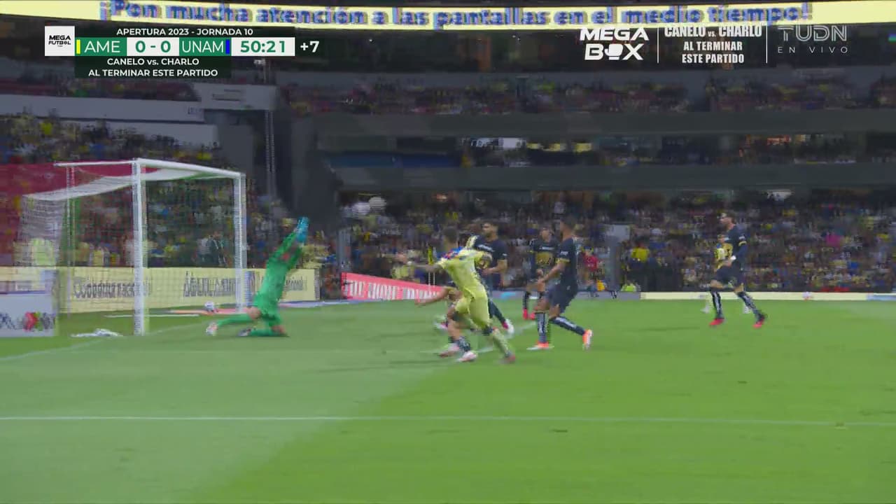 45+4' González llega hasta al área chica, aunque con poco ángulo, el portero universitario acaba por escupir la pelota.