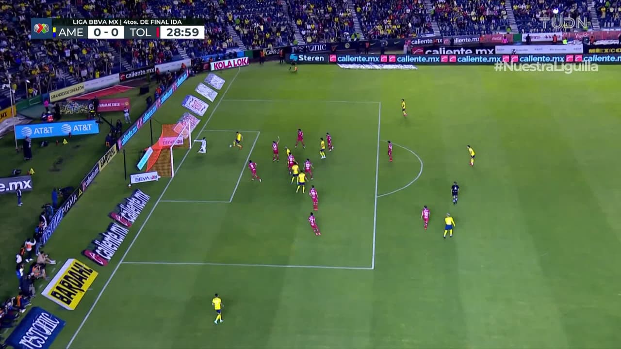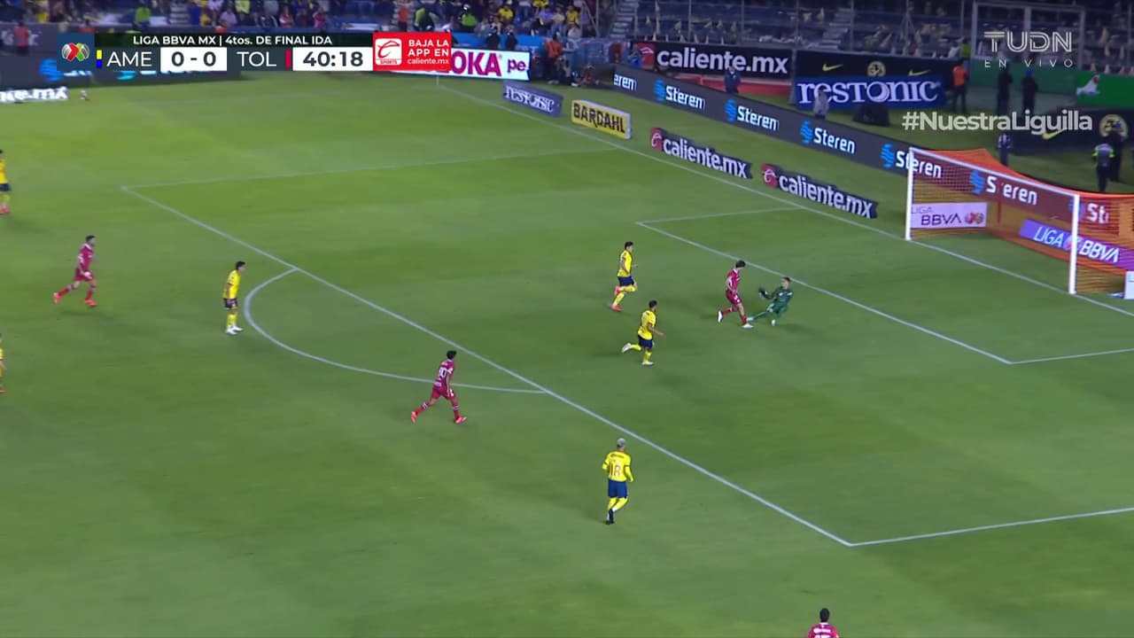 Cristian Calderón limpió la pradera de la izquierda y sacó tremendo trallazo que se fue apenas desviado. Lo intenta América una y otra vez para irse al frente ante Toluca.