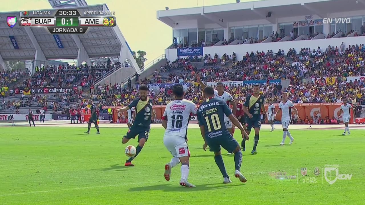 Entonces la posesión comenzó a ser del visitante y al 29’, Oribe hizo efectivo el dominio de su equipo, tras un centro de Mateus Uribe que Domínguez alcanzó a contactar dentro del área, habilitando al capitán americanista que simplemente empujó la bola y puso el marcador 1-0.