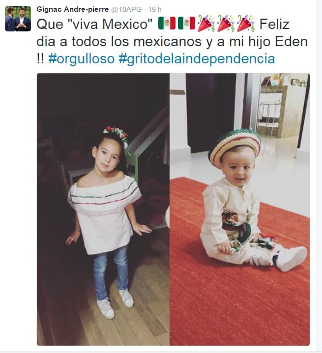 André Pierre Gignac no dejó pasar la oportunidad de felicitar a los mexicanos por su la independencia de México que se celebra este 16 de septiembre. El jugador de los Tigres posteó en Twitter : "Viva Mexico", ¡Feliz día a todos los mexicanos y a mi hijo Eden!