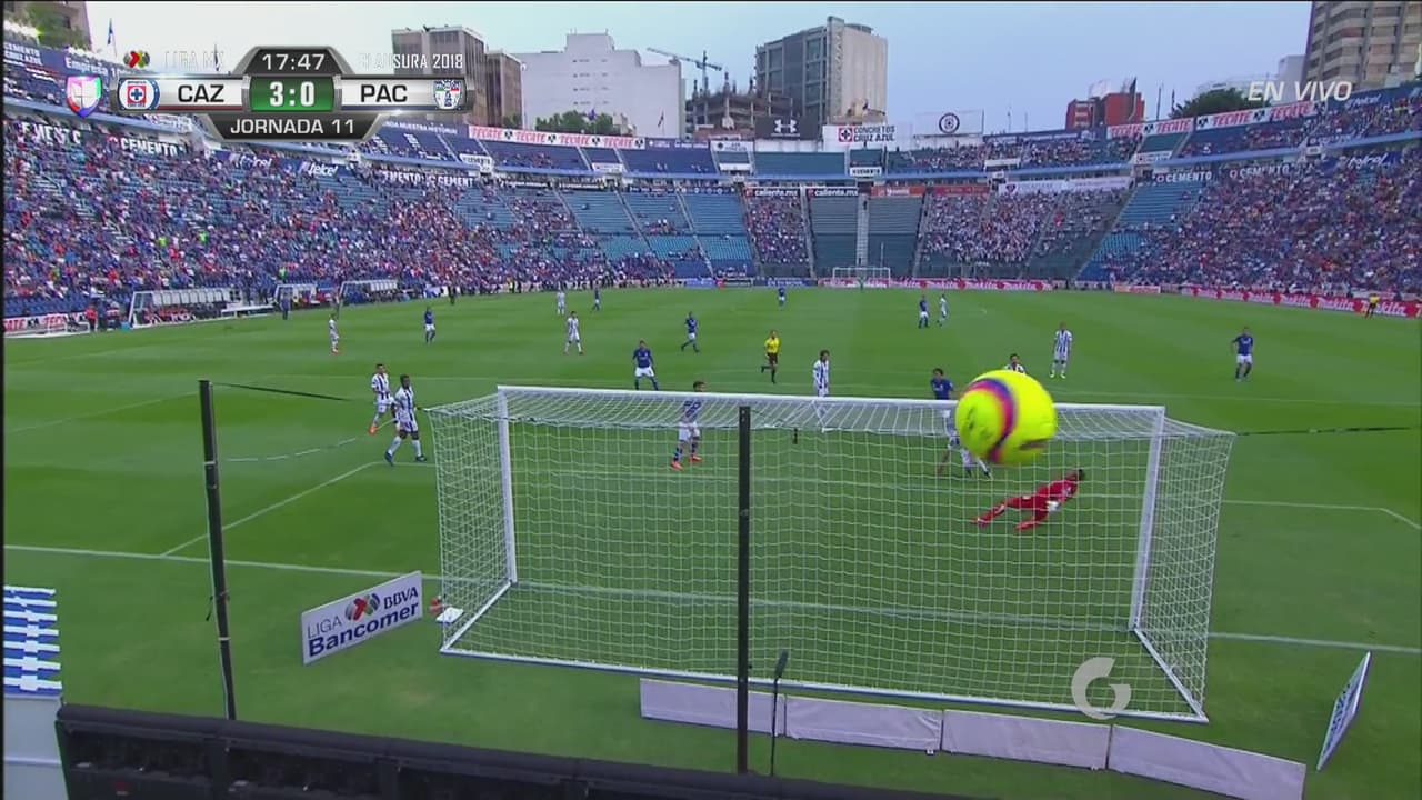 El delantero de Cruz Azul tomó un balón solo en el área, ante una pobre defensa de Pachuca, y disparó por arriba de la portería, en lo que parecía la cuarta anotación del partido.