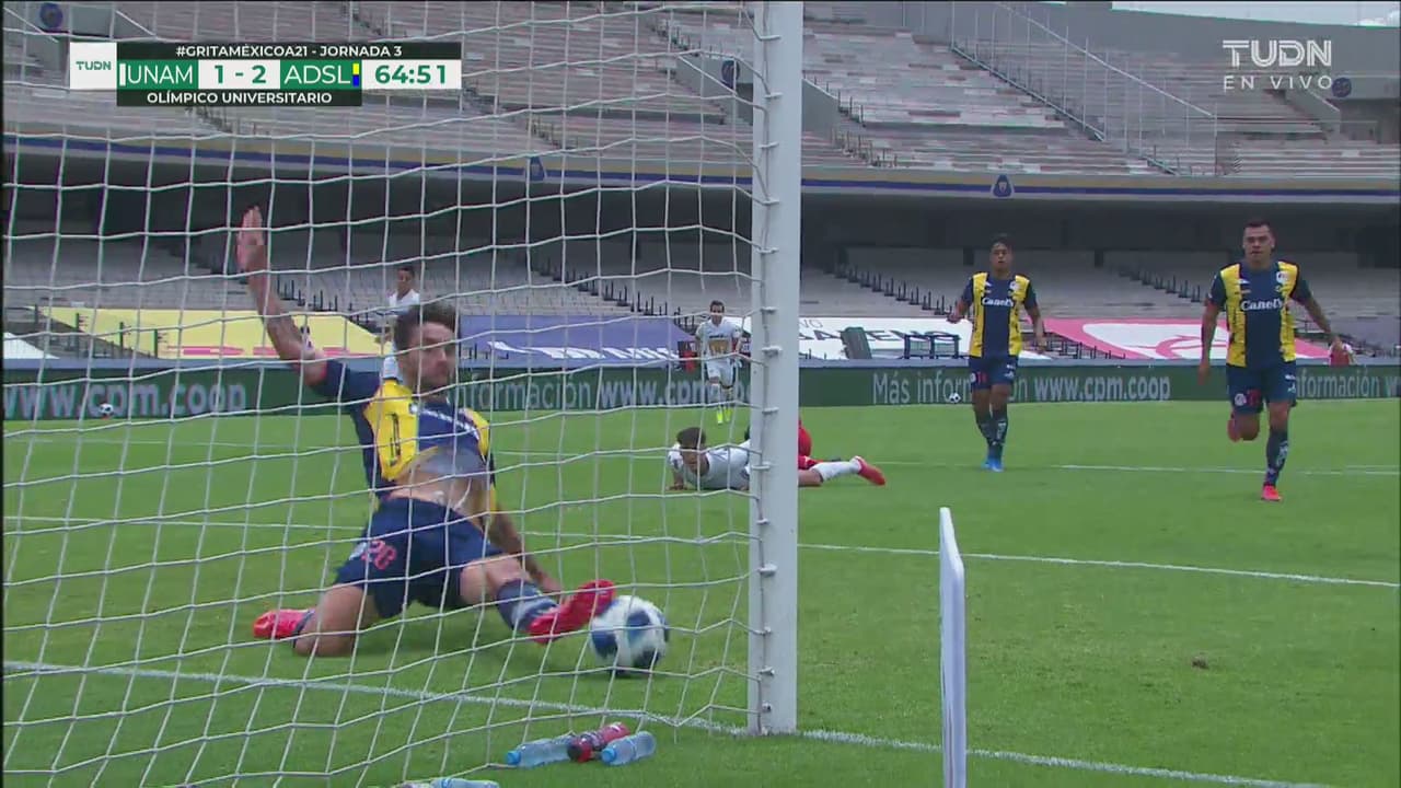 El conjunto de la UNAM tuvo una rápida reacción por conducto de Saucedo, quien se hizo el espacio y metió un disparo con mucha colocación para dejar estático al portero potosino y acercar a su equipo en el marcador.