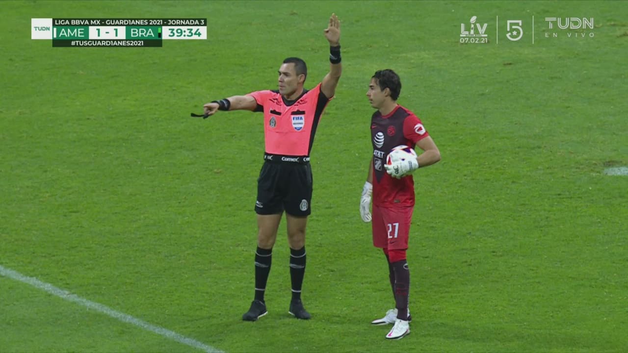 Víctor Velázquez marcó un golazo desde fuera del área que significaba el empate para los Bravos antes de finalizar el primer tiempo, el VAR hizo su chamba y se anuló por fuera de lugar de un jugador que obstruyó al portero. Regla 11, Brizio celebró la decisión.