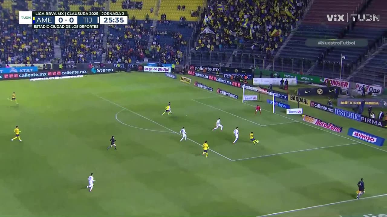 Portales dispara de pierna derecha pero el portero de Tijuana interviene de gran forma para mantener la igualdad en el marcador.