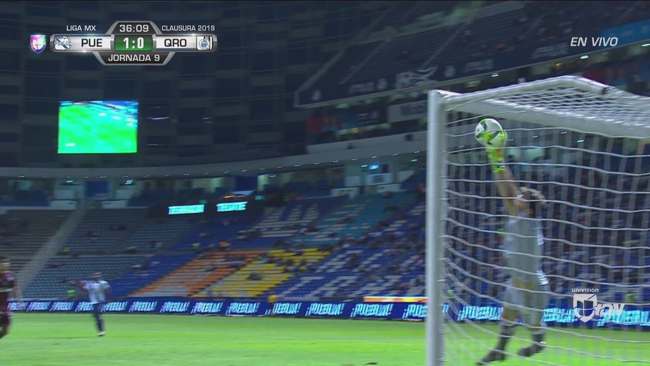 La pelota iba al ángulo pero el guadameta de los Gallos alcanzó a detenerlo.