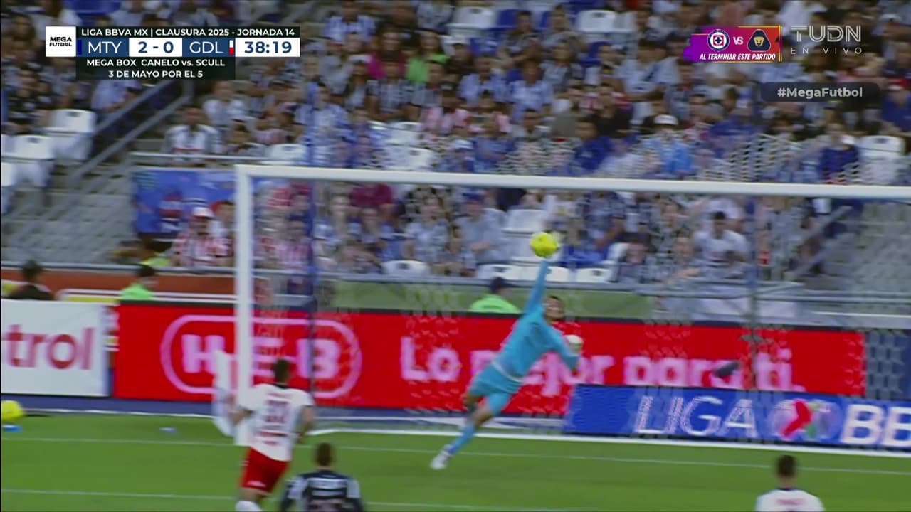 El portero de Chivas realiza una gran atajada a mano cambiada y no da rebote ni manda a tiro de esquina.