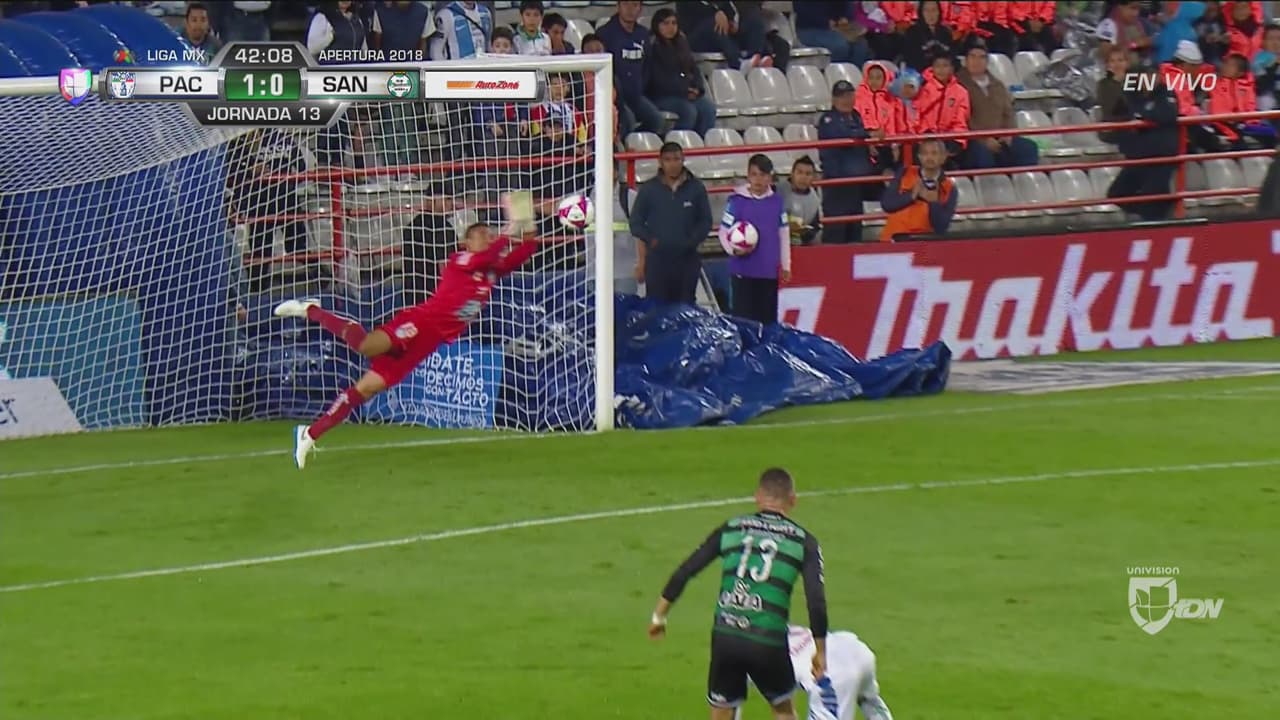 El arquero de los Tuzos voló para detener el tiro del uruguayo.