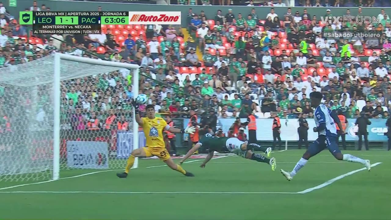 El arquero del Pachuca no se vence y aguanta para desviar el remate de cabeza del futbolista del León.