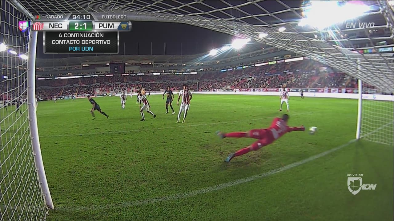 Cabezazo de Felipe Mora a la base del palo pero mejor la reacción del arquero de Necaxa para sostener la victoria en el último minuto.
