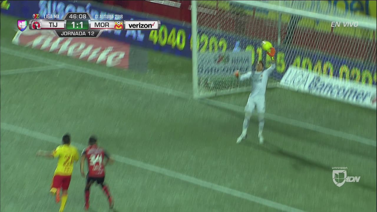 El arquero de Monarcas le robó el gol José García luego de que el atacante de Tijuana rematara solo en el área.