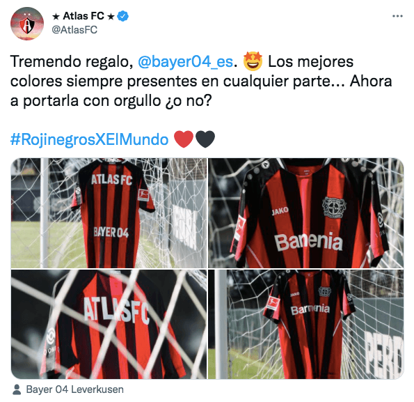 “Tremendo regalo, Bayer Leverkusen. Los mejores colores siempre presentes en cualquier parte. Ahora a portarla con orgullo ¿o no?” tuiteó Atlas, flamante campeón vigente del futbol mexicano.