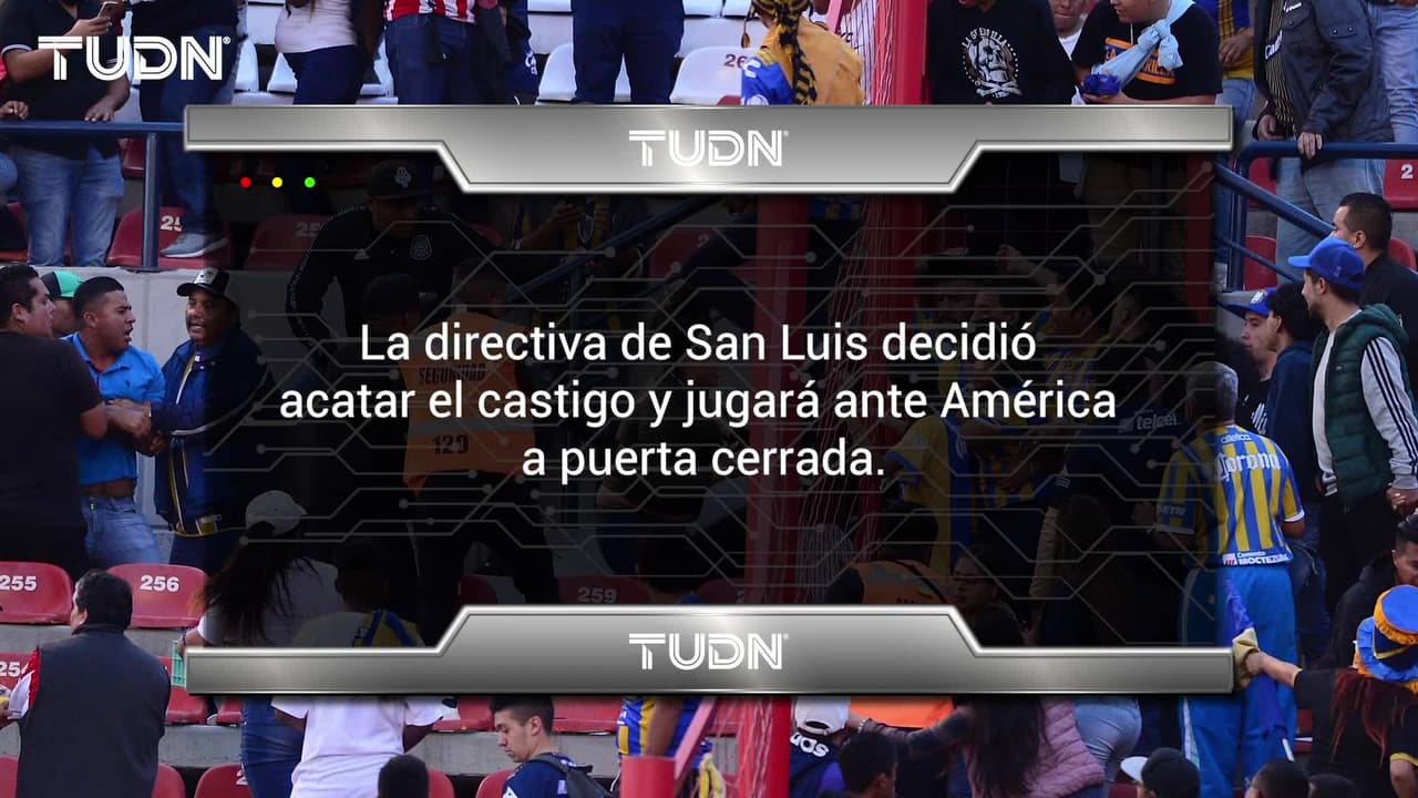 Atlético de San Luis comunicó a toda su afición que los dos partidos que la Comisión Disciplinaria le impuso de sanción por veto al Estadio Alfonso Lastras, después de los incidentes el domingo pasado ante Querétaro, serán a puerta cerrada, por lo que el juego ante América se disputará sin aficionados.
