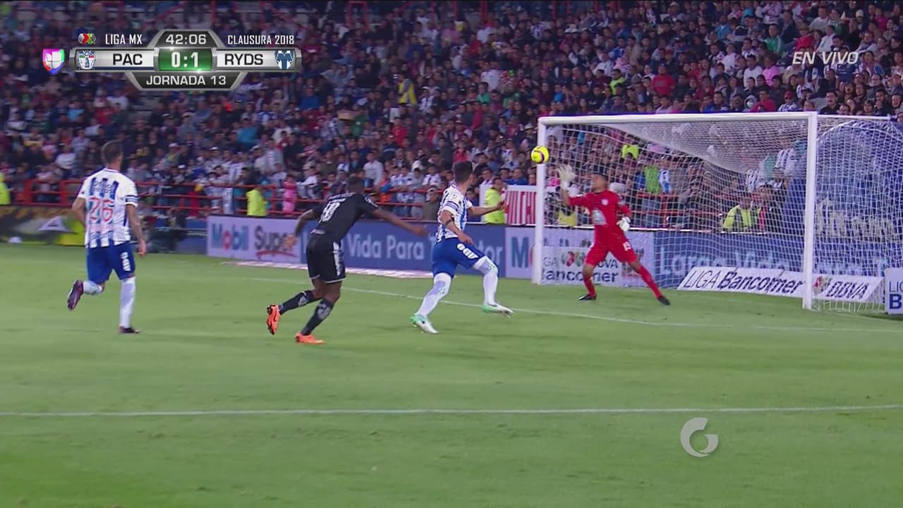 El delantero de Rayados sacó un potente remate de media vuelta que el guardameta de Pachuca desvió a una mano.