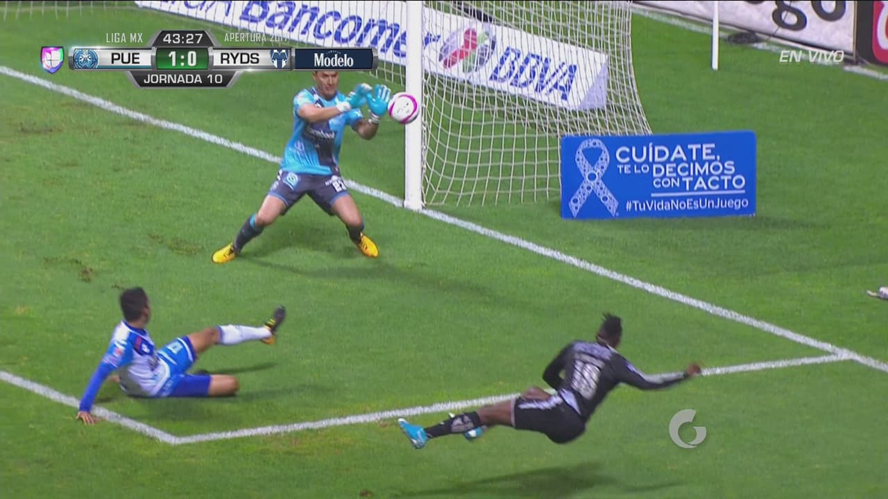 El colombiano de Rayados recibió dentro del área y sacó un potente zapatazo de derecha que el guardameta del cuadro camotero logró desviar a tiro de esquina.