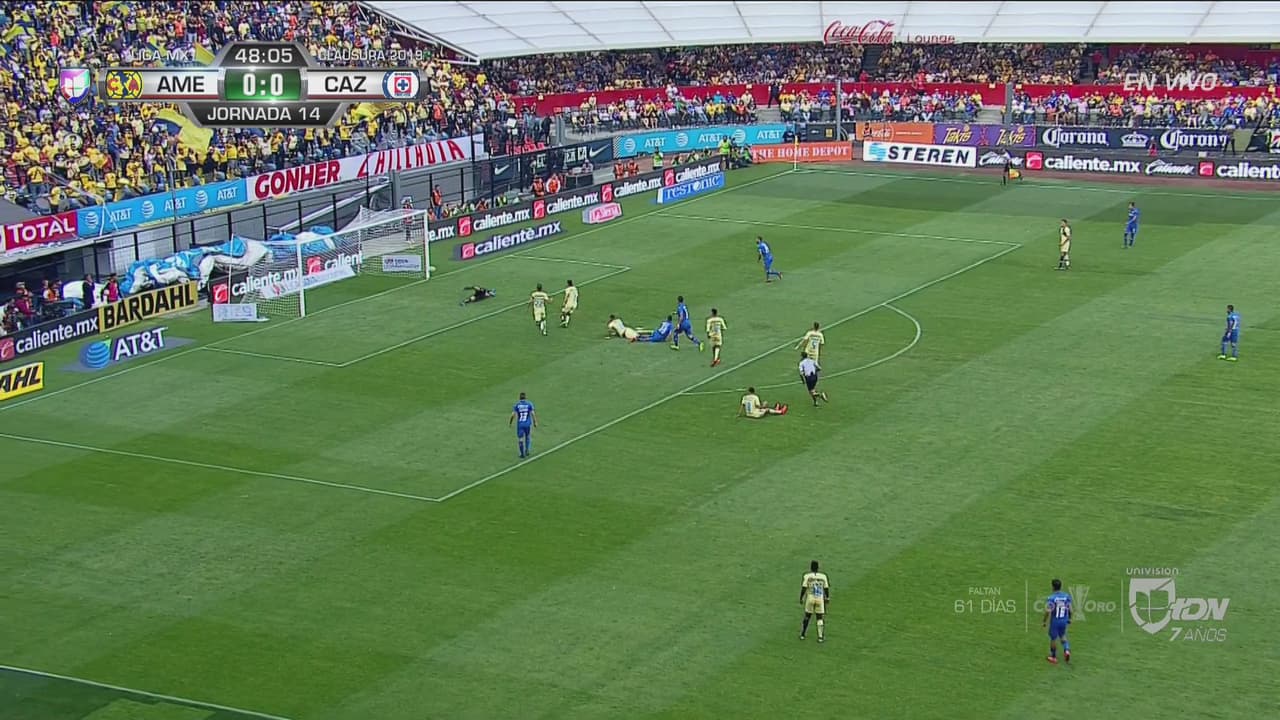 Gran jugada del centrocampista de Cruz Azul que se internó al área del América y sacó un remate rastrero que fue a parar contra la base del poste.