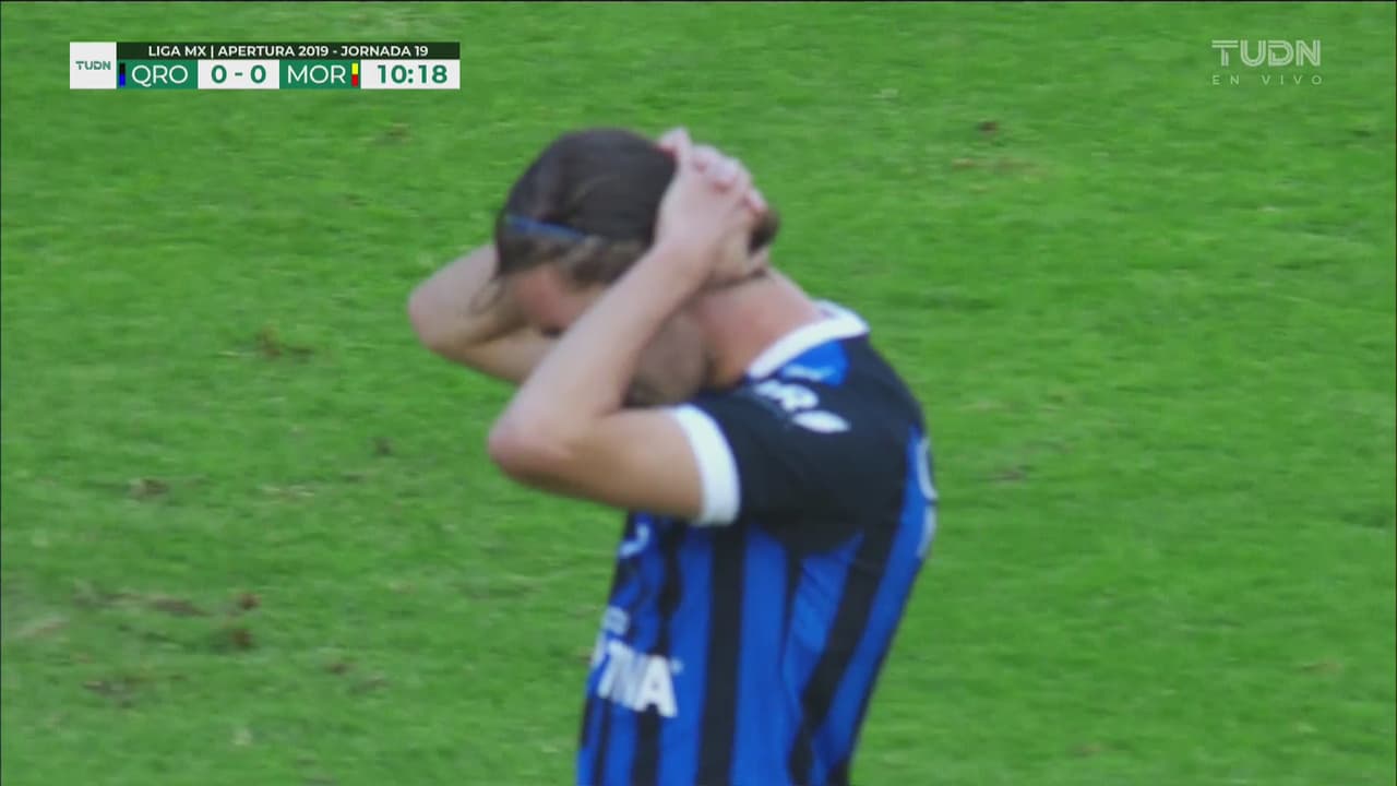 En un centro al área, el delantero colombiano se anticipa a su marca para rematar de cabeza y el balón se va por encima del travesaño.