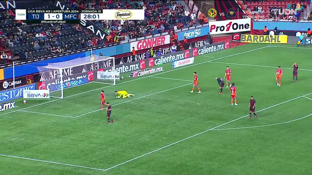 ¡Balón pasa rozando la base del poste! Insiste Tijuana