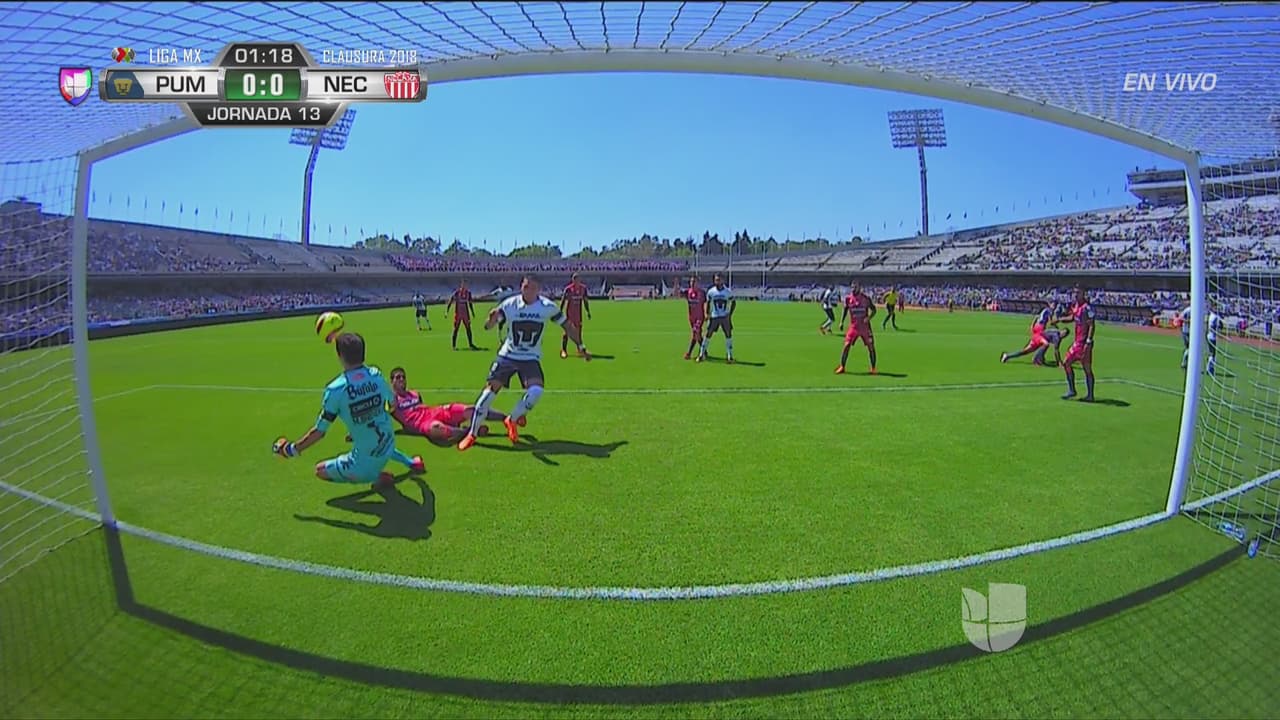El portero del Necaxa atajó un tiro a quemarropa de Nicolás Castillo en el primer minuto de partido y luego volvió a frustrar otro disparo del chileno.