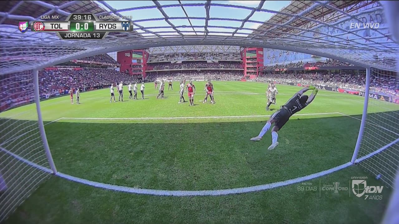 Lance del portero argentino evitando el gol de tiro libre del jugador de Toluca.
