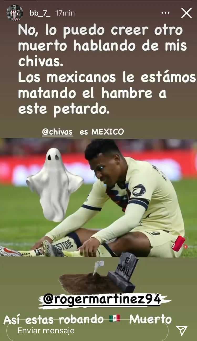 “No lo puedo creer, otro muerto hablando de mis Chivas. Los mexicanos le estamos matando el hambre a este petardo”, afirmó en Instagram el Bofo sobre una imagen de Roger Martínez sentado en la grama y con animaciones de llanto y un fantasma.