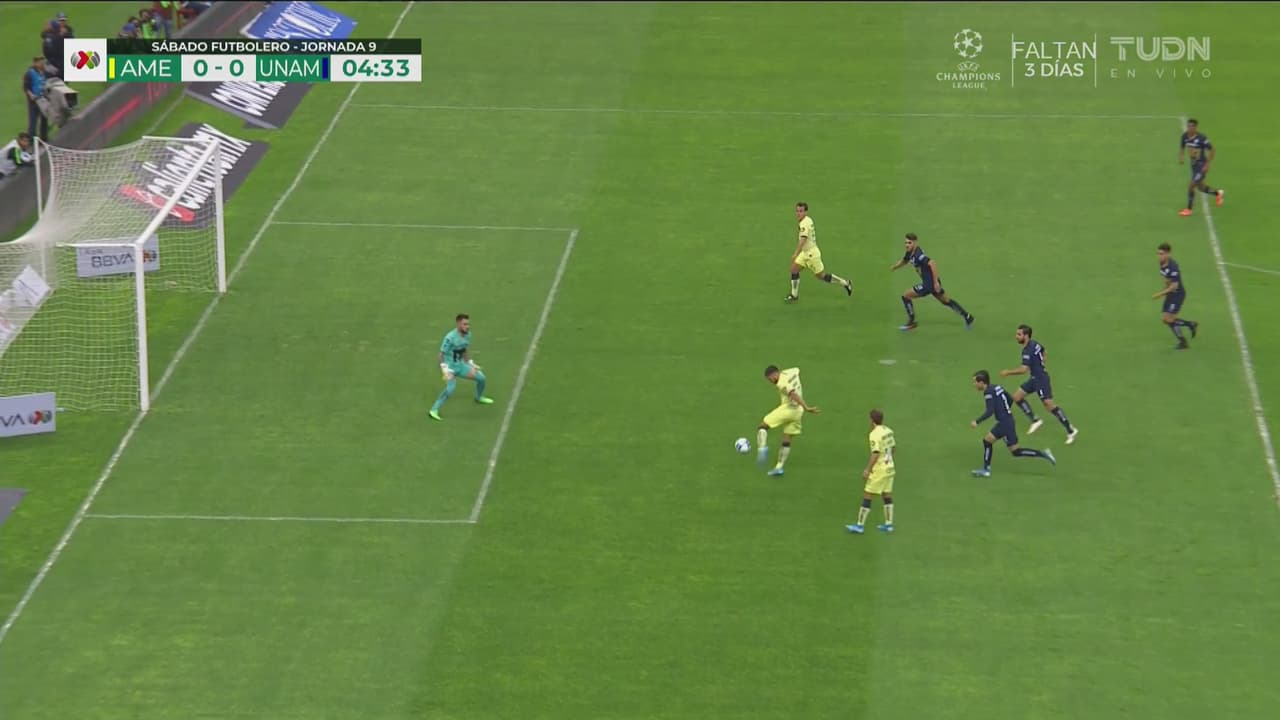 Disparo de Guido que de rebote le cayó al ariete de las Águilas, quien no supo definir al 5’.