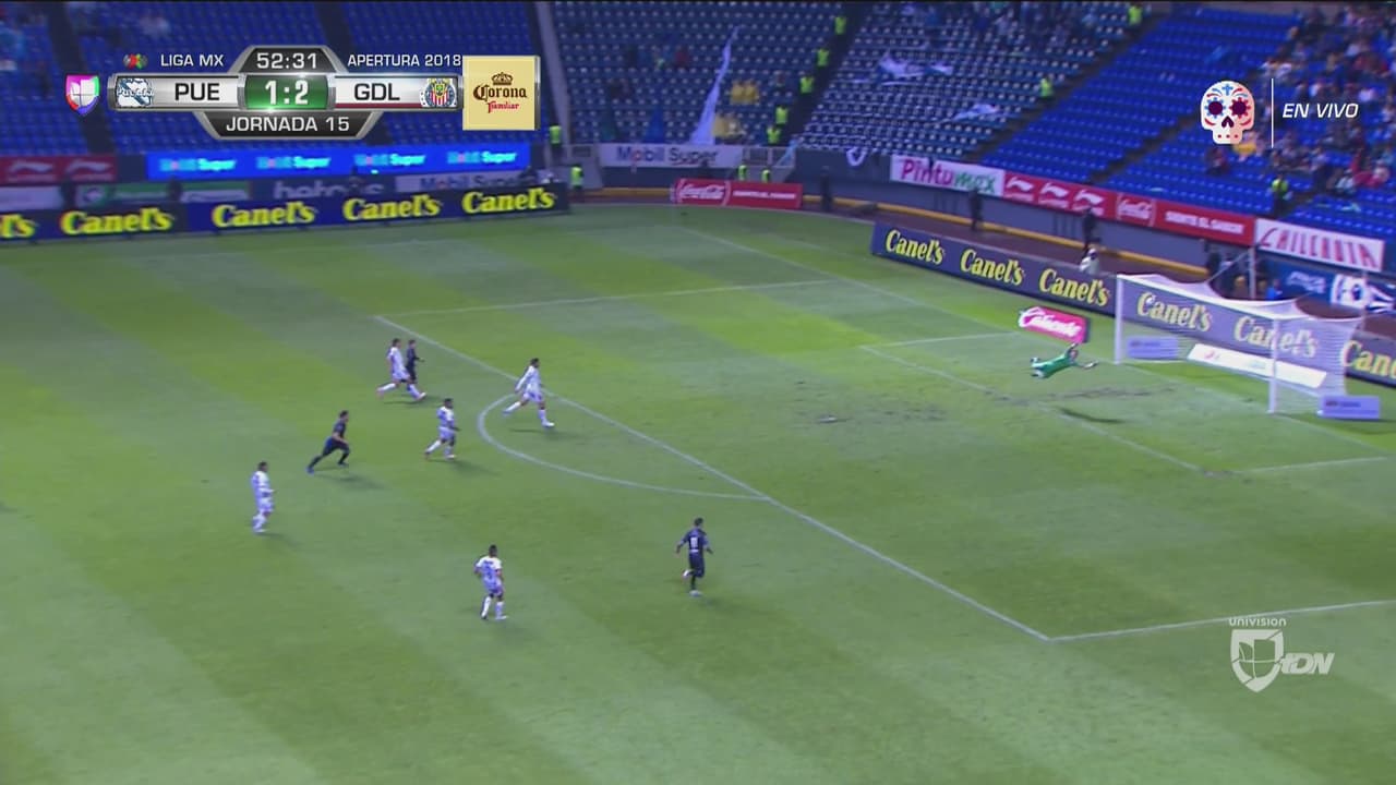 Lucas Cavallini le pegó desde fuera del área y buscaba el ángulo del arco de Chivas, apareció Gudiño a mano cambiada para evitar el empate.