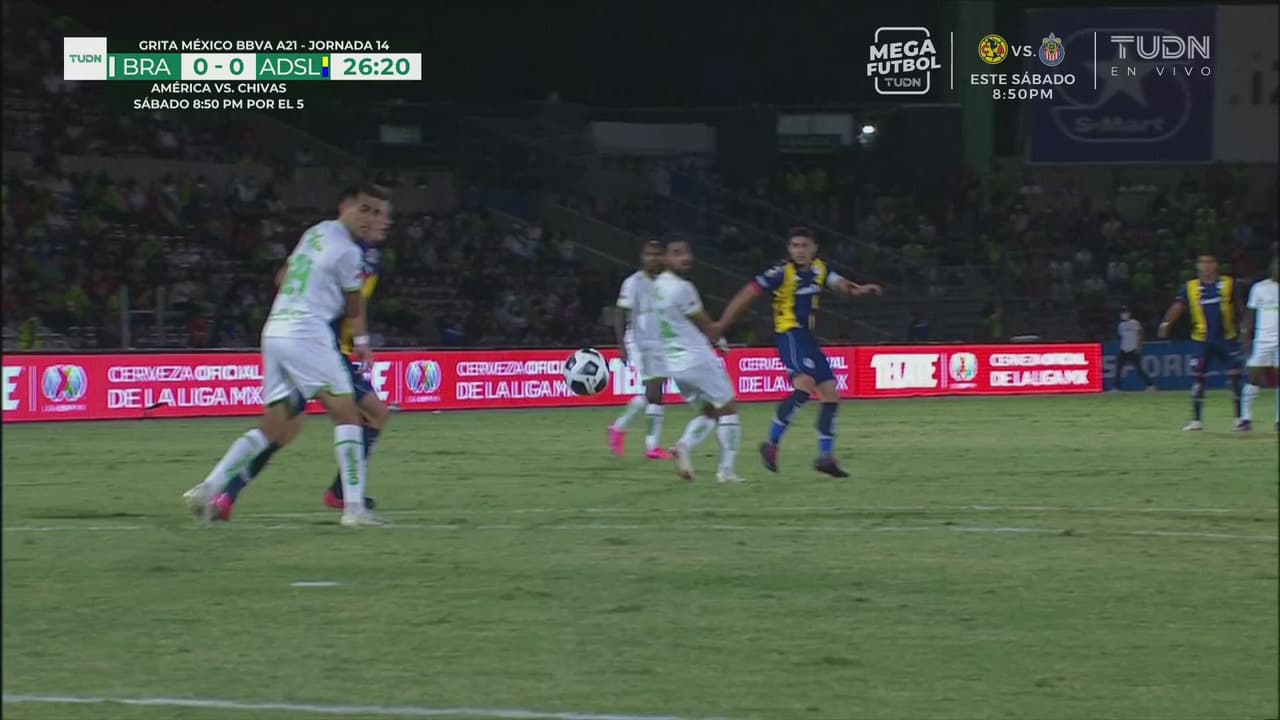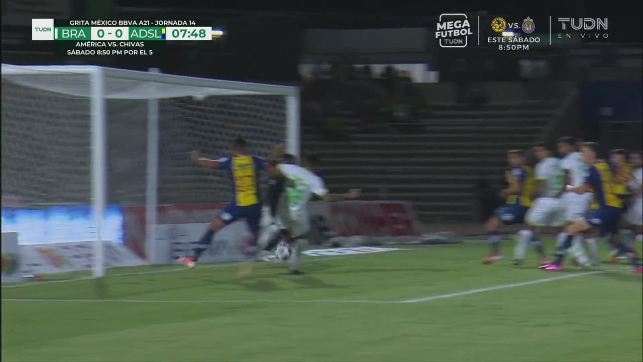 Los potosinos fueron los primeros en poner a temblar el marco de Hugo González con un cabezazo que casí cruza la línea de gol, pero el todo terreno Matías García salvó sobre la raya.