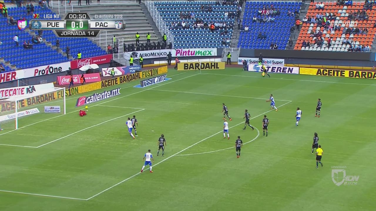 El defensa poblano hizo un tiro de media distancia y el arquero de Tuzos salva su arco en el amanecer del juego.