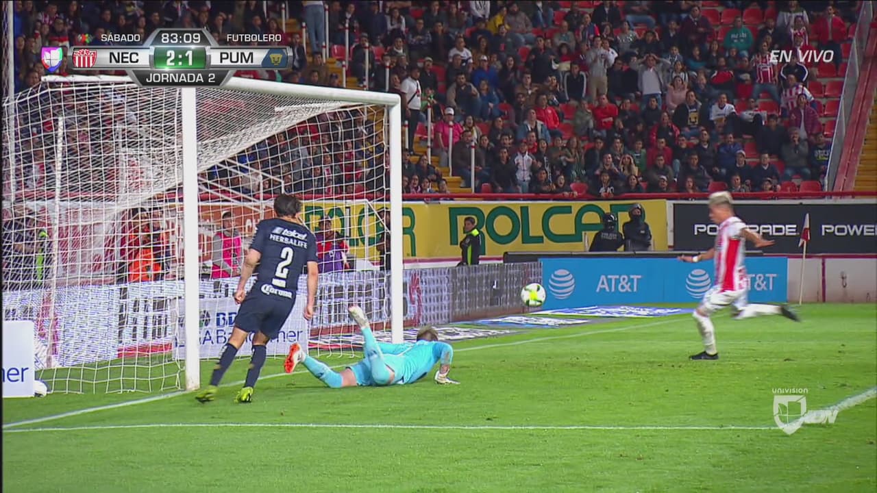 Pedro Campos le gana la posición al defensor de Pumas, la toca hacia atrás donde aparece Brian Fernández y la empuja para convertir el 2-1 de Necaxa sobre Pumas.