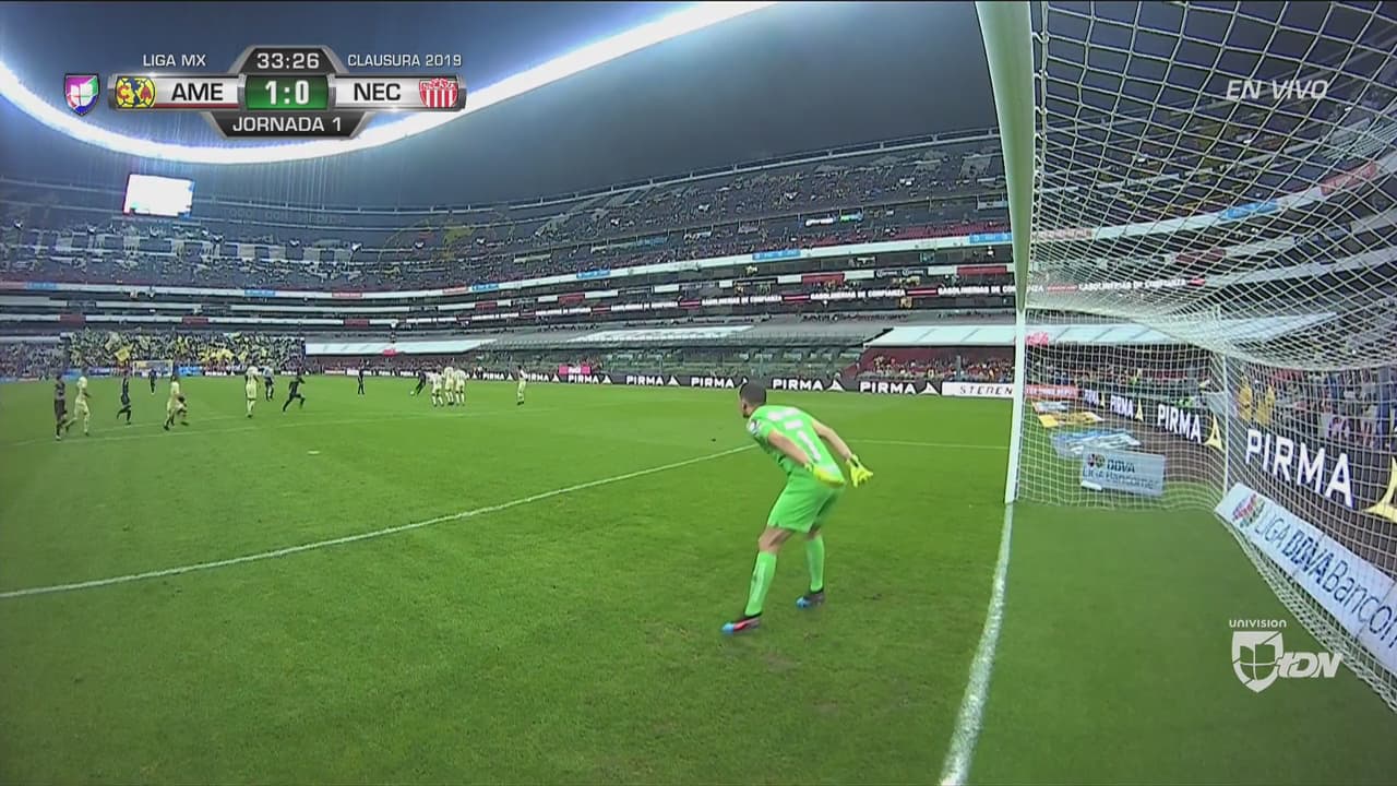 En una jugada a balón parado, el goleador de Necaxa puso a temblar la meta azulcrema pero el esférico terminó fuera.