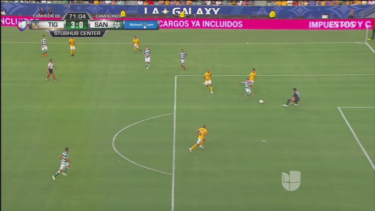 El delantero de Santos se encuentra con el balón en el área y disparó desviado ante el achique de Nahuel Guzmán.