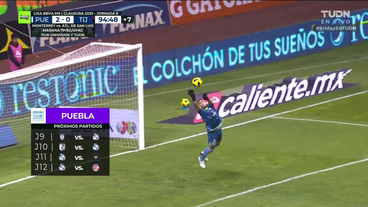 El delantero de Tijuana quería romper el 0 en el marcador pero el guardameta camotero evita el gol.