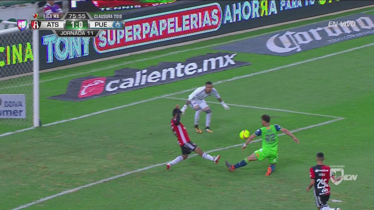El delantero de Puebla se privó y no pudo darle dirección de gol, tras un centro de Tabó por la derecha.