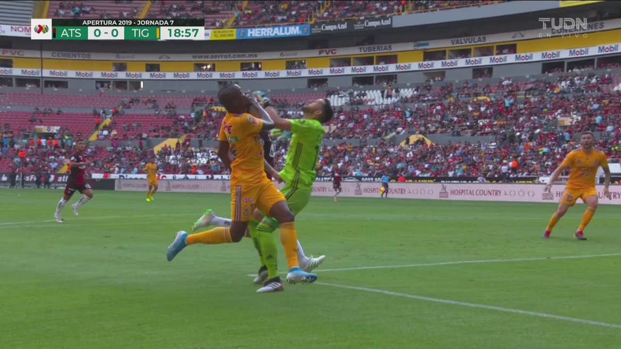 Balón a profundidad para el delantero de los Tigres, pero el portero del Atlas tuvo una gran reacción al minuto 18 para mantener su arco invulnerado.
