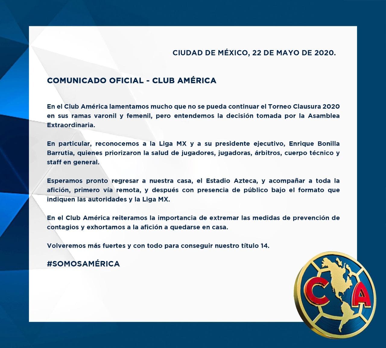 El Club América, así como varios protagonistas del futbol mexicano, lamentaron la cancelación del Clausura 2020, pero coinciden en que fue la mejor decisión debido a la crisis sanitaria por la que se atraviesa debido al coronavirus.