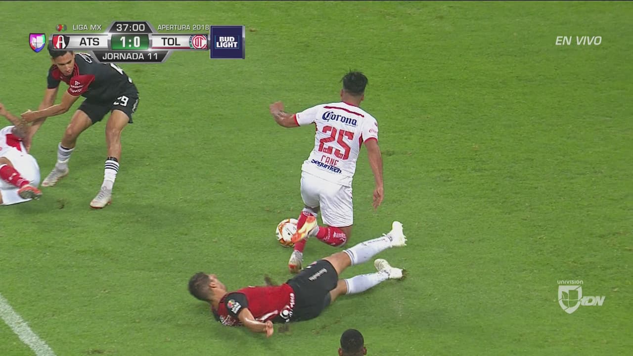 El delantero 'choricero' ya le había ganado la posición al defensor 'rojinegro' pero decidió tirarse y el árbitro no cayó en el engaño.