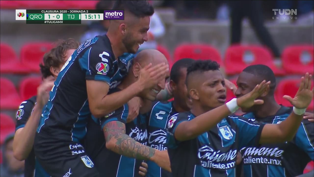 El delantero de Querétaro bajó con calidad la pelota dentro del área y sacó el izquierdazo por el piso a la esquina del arco de Lajud. Querétaro 1-0 Xolos de Tijuana.