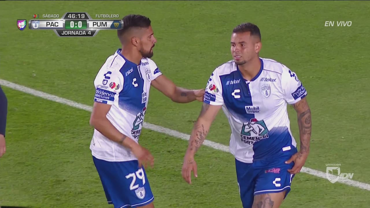 Una gran jugada colectiva del Pachuca dejó a Cardona solo frente al arco de Pumas, pero golpeó el balón con demasiada fuerza y salió por encima del travesaño.