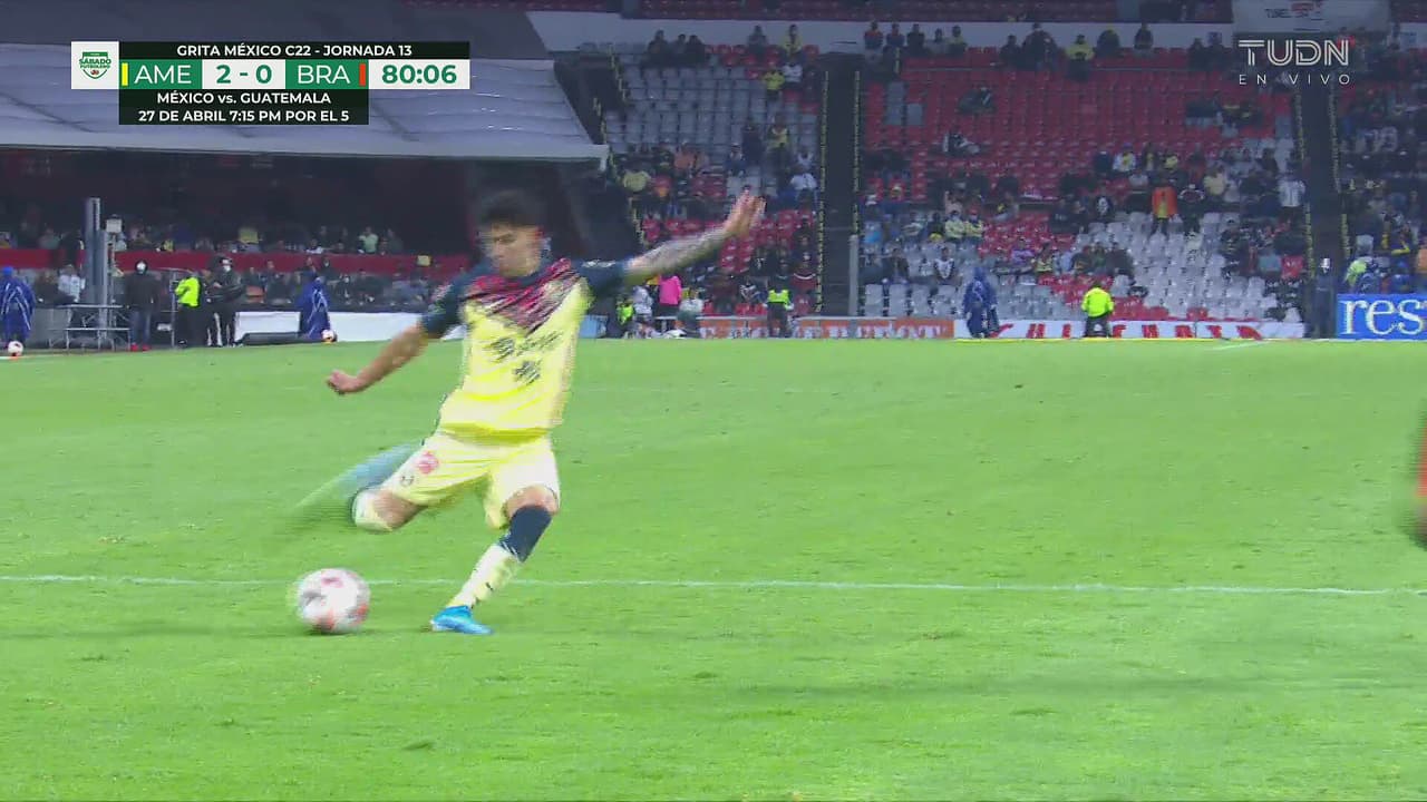 El lateral no tenía de otra que disparar, pero se va por arriba de la portería de Bravos, al 80'.