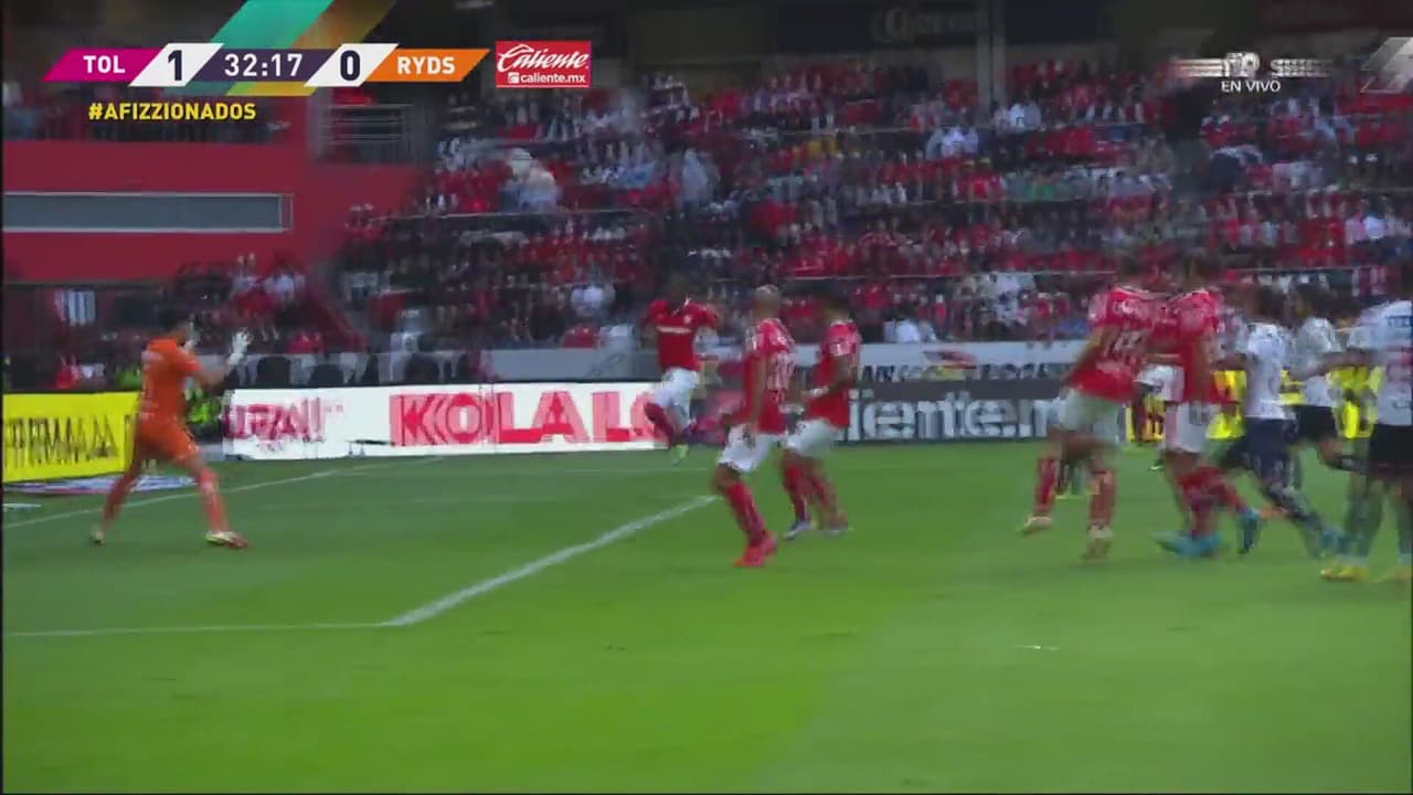 Tiro libre que quiere aprovechar Toluca y el defensor la desperdicia de manera terrible.