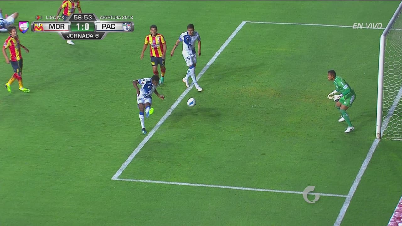 El defensa colombiano rechazó muy mal un servicio por derecha del Morelia y por poco mete el balón en su propia portería.