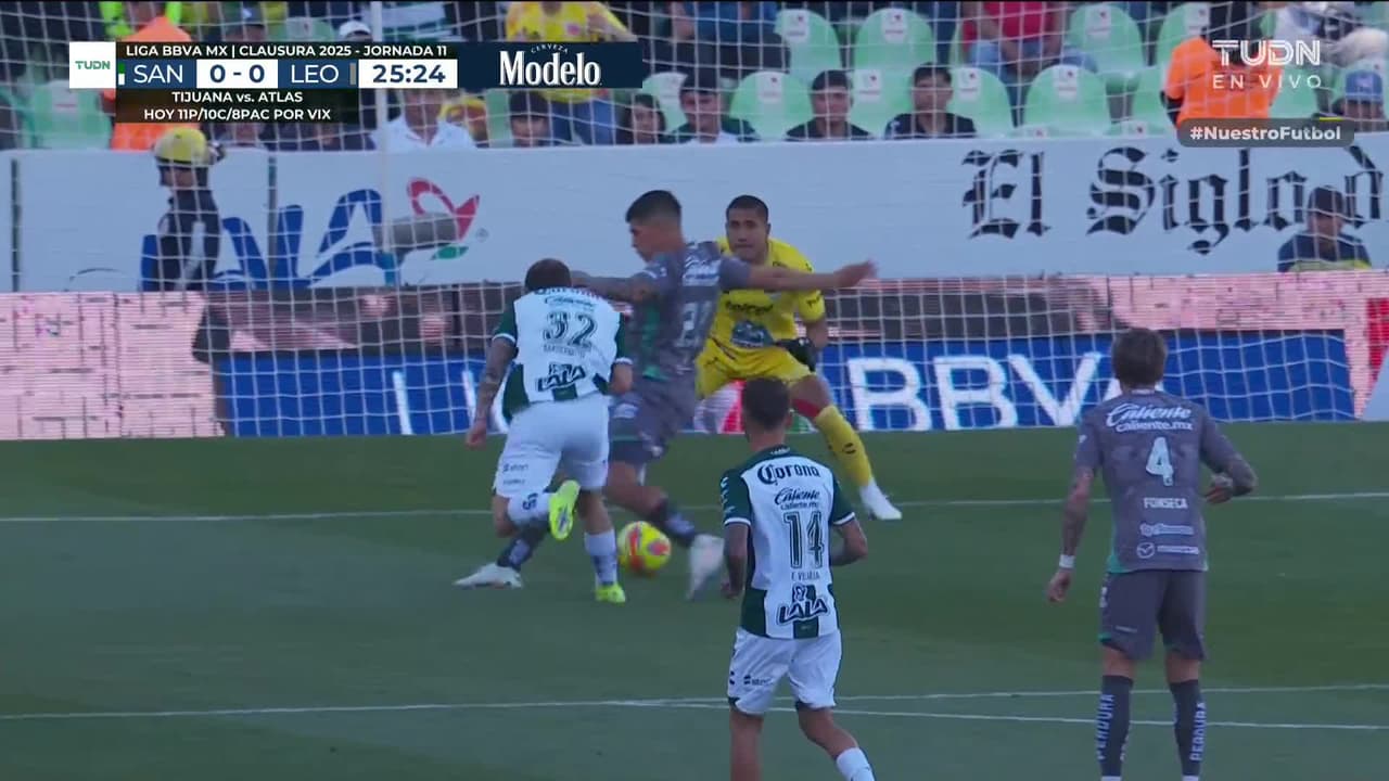 Aldo López (Santos Laguna) remata al travesaño| zurdazo desde el centro del área.