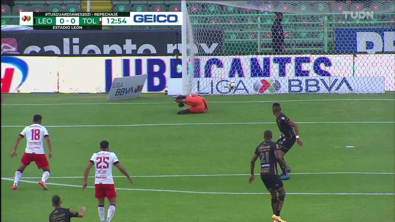 Alexis Canelo (Toluca) remata al poste izquierdo| Disparo con la derecha desde fuera del área.
