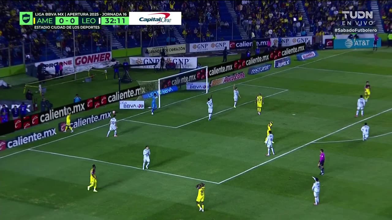 Álvaro Fidalgo (América) remata al poste izquierdo| zurdazo sin ángulo desde la izquierda.