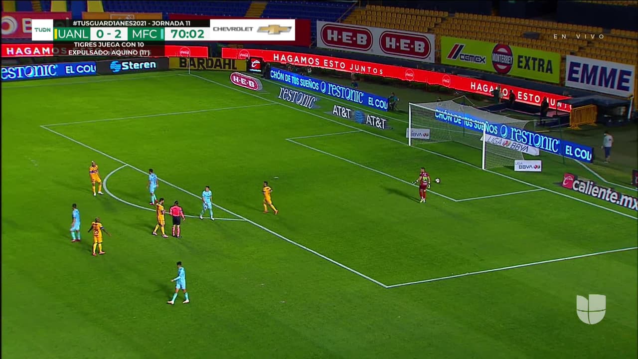 ¡Penalti fallado! Tigres 0| Mazatlán FC 2. André-Pierre Gignac (Tigres) remata palo| Disparo con la derecha.