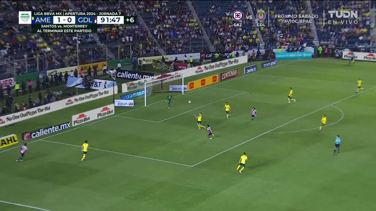 Brian Rodríguez (América) remata al travesaño| Disparo con la derecha a quemarropa desde el lado izquierdo.