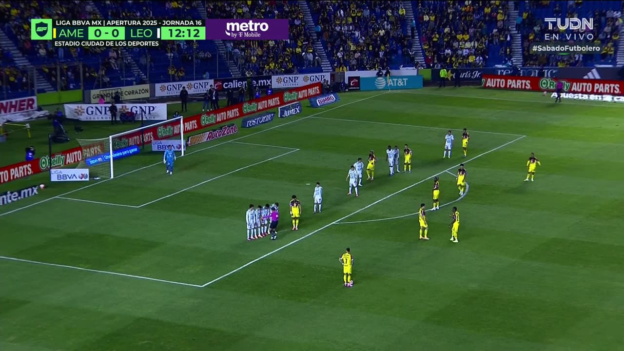 Brian Rodríguez (América) remata palo| Disparo con la derecha desde fuera del área de tiro libre directo.