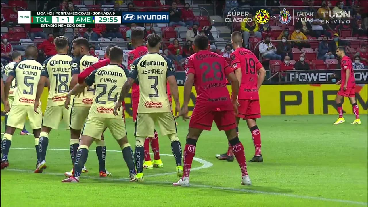 Claudio Baeza (Toluca) remata al poste derecho| disparo de cabeza desde el centro del área tras el cobro de una falta.